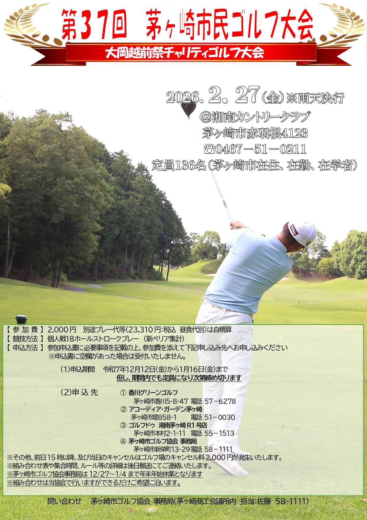 茅ヶ崎ゴルフ協会主催による「第37回茅ヶ崎市民ゴルフ大会&大岡越前祭チャリティーゴルフ大会」が開催されます。