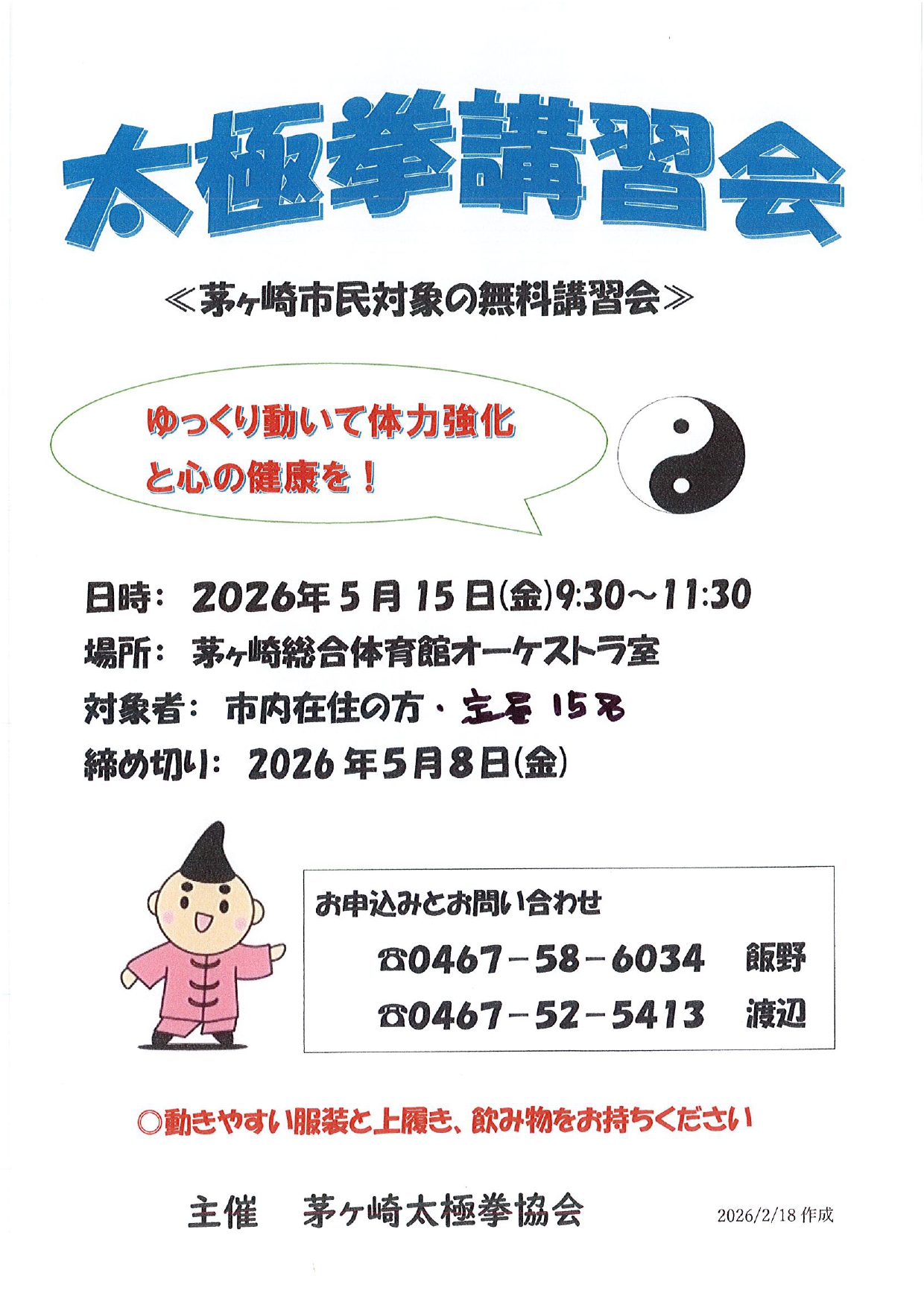 茅ヶ崎太極拳協会主催による茅ヶ崎市民対象の初心者向け太極拳講習会の令和8年度開催のご案内です。